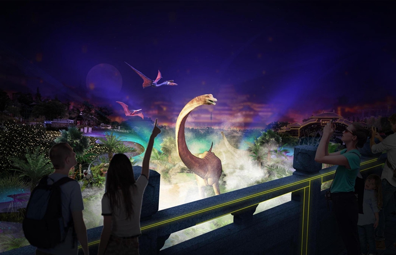 本届灯会在“好看”上再次创新,利用园中河谷地势环境,巧妙融合自贡特色仿真恐龙、自贡彩灯和前沿AI科技,再现史前侏罗纪恐龙谷。谷中,还有一组“穿越”到侏罗纪的“恐龙战队”,通过先进的视觉识别、多感知交互以及高精度声源定位等技术与游客亲切互动。
