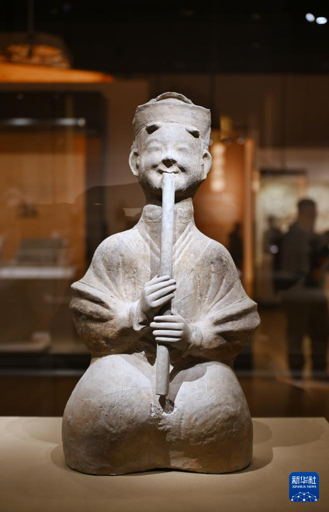 图为展出的汉代陶吹笛俑(1月20日摄)。新华社记者 刘坤 摄