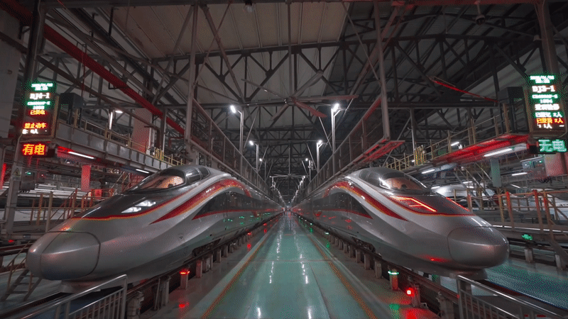 在中国铁路成都局集团有限公司成都动车段成都东动车运用车间检修库,一组组动车组正缓缓驶入,库内检修人员在停稳的动车组上,检查车顶设备状态、查看车内服务设施、开展动车组安全检查。