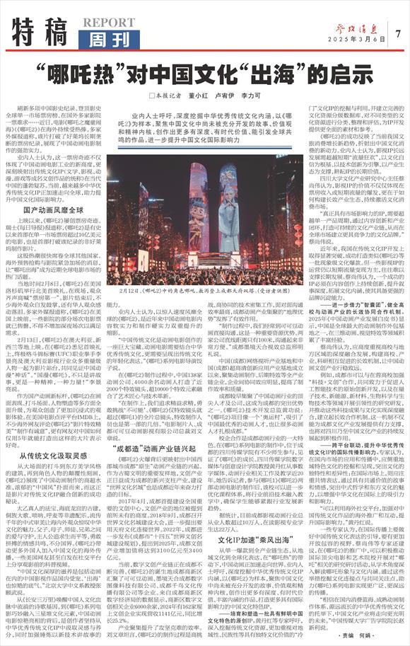 从单一爆款到全产业链生态,从地域文化到全球化表达,在“哪吒热”的带动下,中国动画正加速走向世界。业内人士呼吁,深度挖掘中华优秀传统文化IP内涵,以《哪吒2》为样本,聚焦中国文化中尚未被充分开发的故事、价值观和精神内核,创作出更多有深度、有时代价值、丰富内涵的作品,打造更多具有国际影响力的中国文化特色IP。