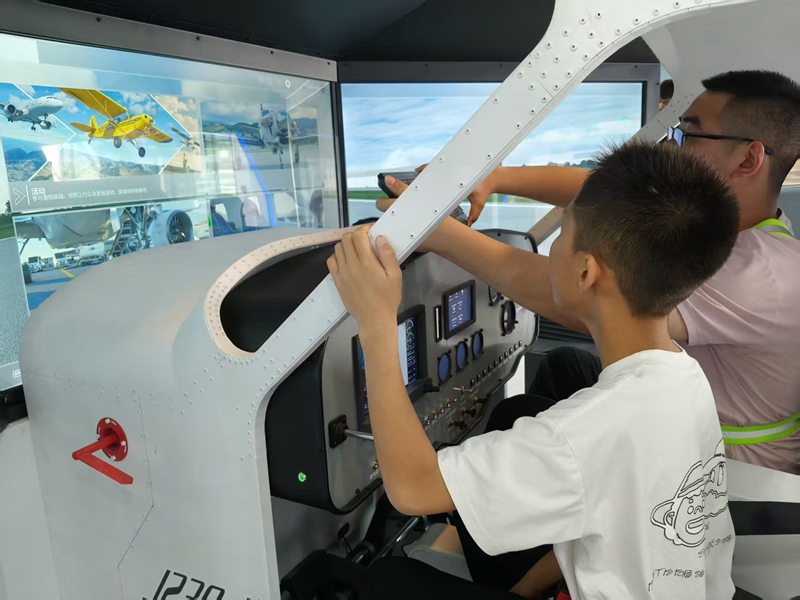孩子们在北川永昌机场体验全真模拟飞行器。(北川县委宣传部 供图)