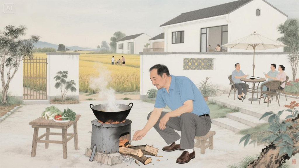 丁黎均心里的“土灶红”VS女儿笔下的“极简白”,最终方案:磨盘嵌进水泥地,露台接住整片星空和稻浪。