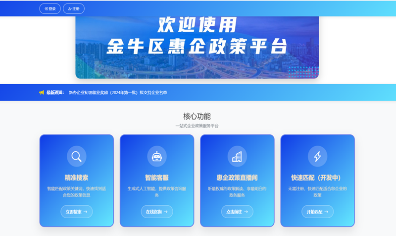 惠企政策红利要精准“滴灌”企业,第一步是确保企业能“看得见、摸得着”。金牛区依托政府门户网站创新打造了“金牛惠企政策”智能查询平台,为企业搭建政策获取“直通车”。该平台如同“政策超市”,集成展示全区现行有效的产业扶持、金融信贷、人才激励、科技创新等各类惠企政策。企业输入关键词或按行业、类型筛选,即可清晰查询政策条款、适用对象、申报条件(材料)以及咨询方式等核心要素信息。平台后端链接成都市“蓉易享”系统,致力于打通政策“汇聚—查询—申报—兑现”的全链条“一站式”服务,让信息多跑路,企业少跑腿。