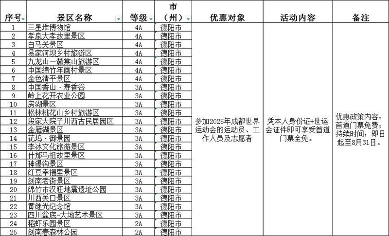 今年8月,2025年第12届世界运动会在四川成都举行。四川省德阳市的A级旅游景区联合推出优惠政策。