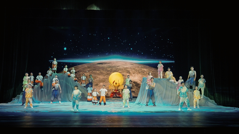 “我们想让这首歌回到千百年前,回到山河湖海、星辰宇宙中的求索与叩问。”本次《玉盘》的舞美设计紧扣“从地向天、由外而内”的情感线索。第一段主歌以地球场景为主,通过投影呈现屋檐、山川、湖海等自然意象;从间奏起,舞台转向星空,孩子们仿佛徜徉于银河,在回望地球的画面中完成对自我内心的叩问。服装方面,彝族元素与现代剪裁相结合,汉族儿童服饰则采用彩色泼墨的设计,传递写意与自然之美。整个舞台力图在简约中见深意,在写实中藏诗意,构建出一幅跨越时空的“问月图卷”。