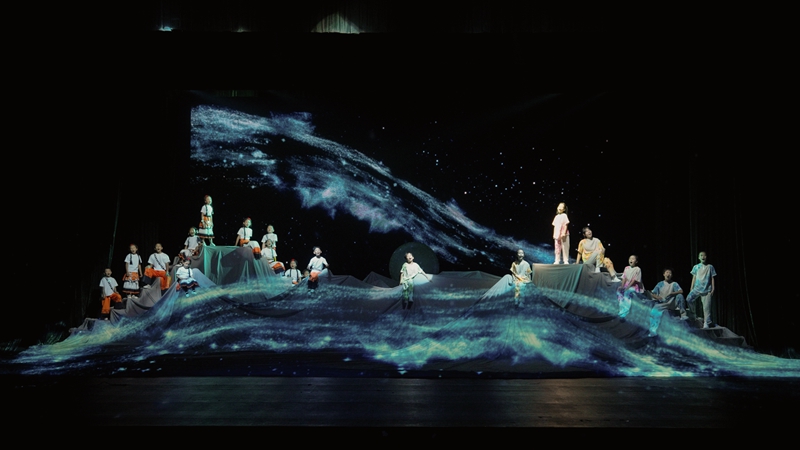 演出延续了大凉山彝族的孩子们与汉族儿童共同演唱的形式,并加入凉山歌舞团的成年舞者,他们以“托举”动作象征代际之间的传承。“这种托举既有看得见的,也有看不见的。台上除了表演的舞者,还有幕布下把孩子们托起来的哥哥们,他们作为凉山歌舞团的专业舞蹈演员,却承担了不露脸的工作。这既是大人对孩子的托举,也呼应了歌曲中一代一代无休止的传承求索精神,表达了中华民族在仰望星空中不断前行的意象。”谭淇尹解释道。