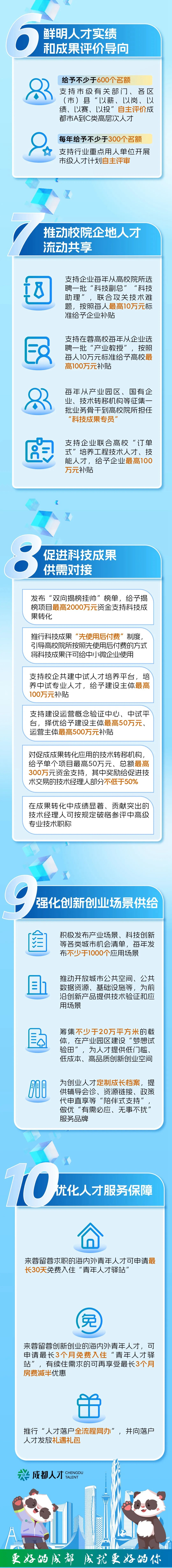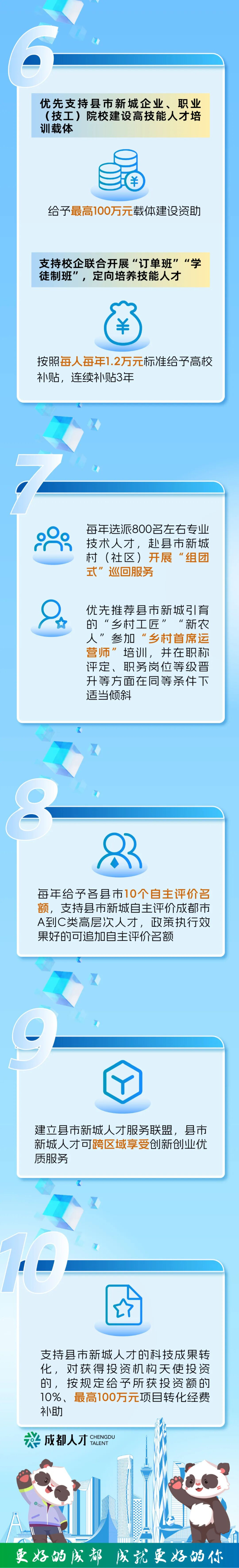 同时,成都聚焦县市新城高质量发展,出台了十条措施支持县市新城吸引集聚人才,聚焦加大人才计划支持、开展柔性引才、开展“人才联聘”、促进合作交流、培养技能人才、引导人才入乡、开展自主认定、强化服务保障、加大资金投入等方面提出27项举措,为县市新城高质量发展提供坚实人才支撑。