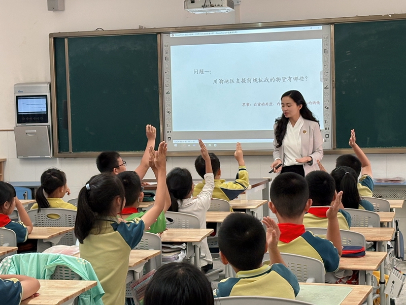 活动现场,四川博物院讲解员以抗战为主题开展讲座。讲座以“从抗战精神到家国力量”为切入点,用通俗易懂的语言、鲜活的历史案例,向同学们讲述川军出川抗战、后方民众支援前线等故事,还穿插互动提问,同学们踊跃举手,现场氛围热烈。