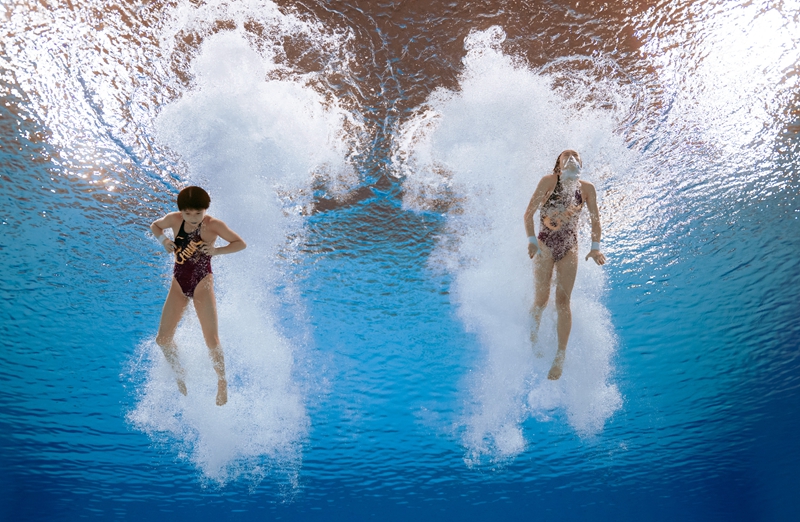陈佳和杨睿琳再次出战首个比赛日的第三个比赛项目。第一轮两人都选择了相同的动作——向内翻腾两周半动作,最后一跳也都以向前翻腾两周半转体一周结束。5跳全部结束后,陈佳总分344.40分,杨睿琳总分342.90分,两人分别位列该项目第3名、第4名。