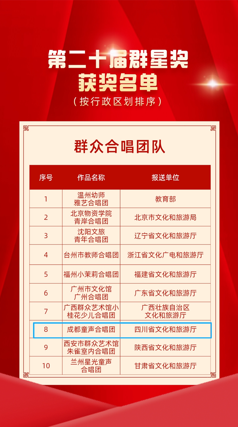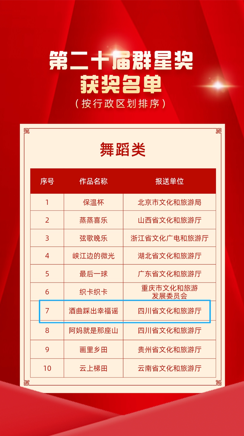 11月4日,第二十届群星奖颁奖仪式举行,现场揭晓了群星奖各门类奖项,其中成都市2件作品(团队):群众合唱团队成都童声合唱团、舞蹈作品《酒曲踩出幸福谣》脱颖而出。
