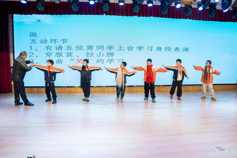 活动期间,省级非遗代表性传承人聂绍红一行走进渠县第五小学,为师生开启了一场生动有趣的川剧沉浸式体验。聂绍红以通俗易懂的语言向同学们介绍了川剧历史以及川剧艺术五大声腔的特点。在互动环节,徐晚霞等演职人员为女同学穿上表演服饰,手把手示范指法和动作,为男同学挂上胡子,指导身段表演与表情动作,指导孩子们用川剧片段的曲调学习演唱川剧,通过观看视频的形式辅助讲解川剧5大行当的特点。