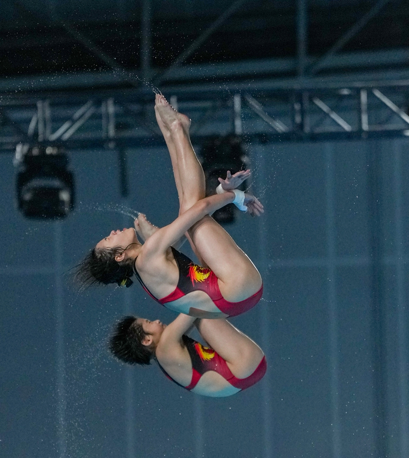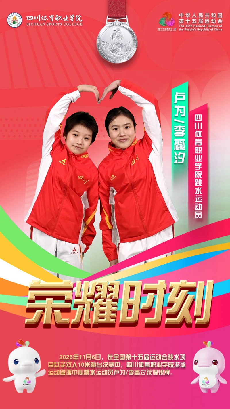11月6日晚,第十五届全国运动会跳水项目女子双人10米跳台决赛,四川体育职业学院游泳运动管理中心跳水运动员卢为/李蕊汐组合以5跳322.44分的成绩夺得银牌。
