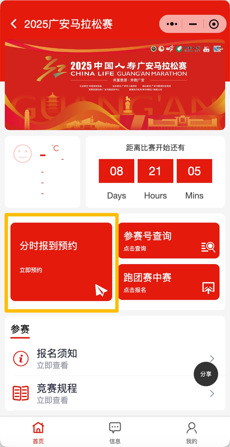 2.参赛选手须在广安马拉松“参赛助手”小程序预约报到时段。