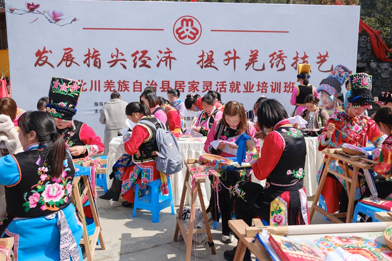 在“振兴工坊”,羌族绣娘任冬梅手中的针线在布料间灵巧穿梭,一幅精美的羌绣图案逐渐成形。“以前做绣活只是个人爱好,现在通过‘振兴工坊’,作品能销往全国各地,每月能增收3000多元。”她笑着说。