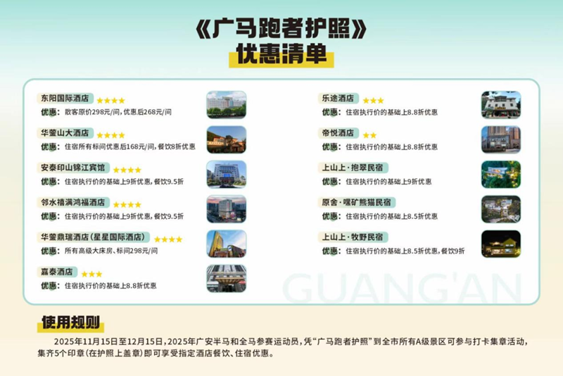 凭“广马跑者护照”到全市所有A级景区可参与打卡集章活动,集齐5个印章(在护照上盖章)即可享受指定酒店餐饮、住宿优惠。