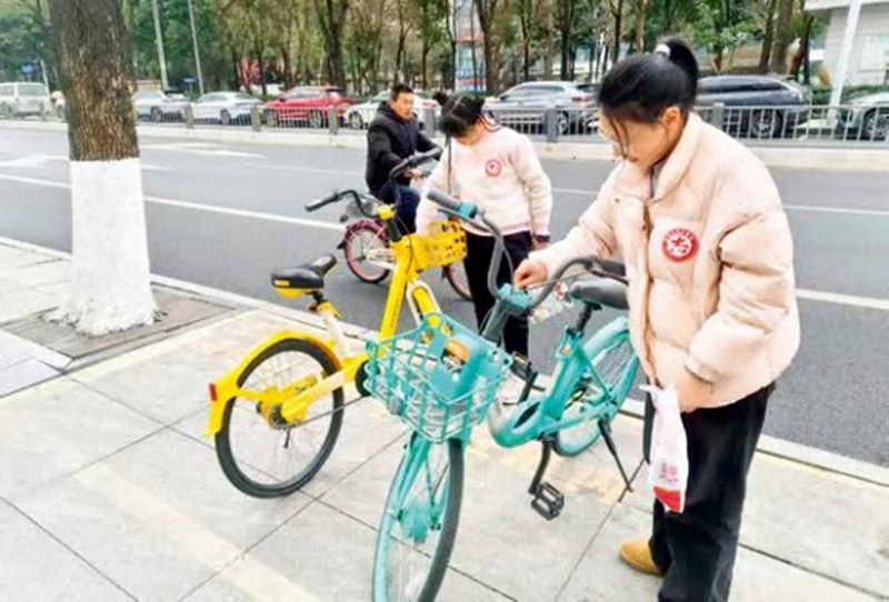 志愿者整理共享单车。(成都高新区桂溪街道 供图)