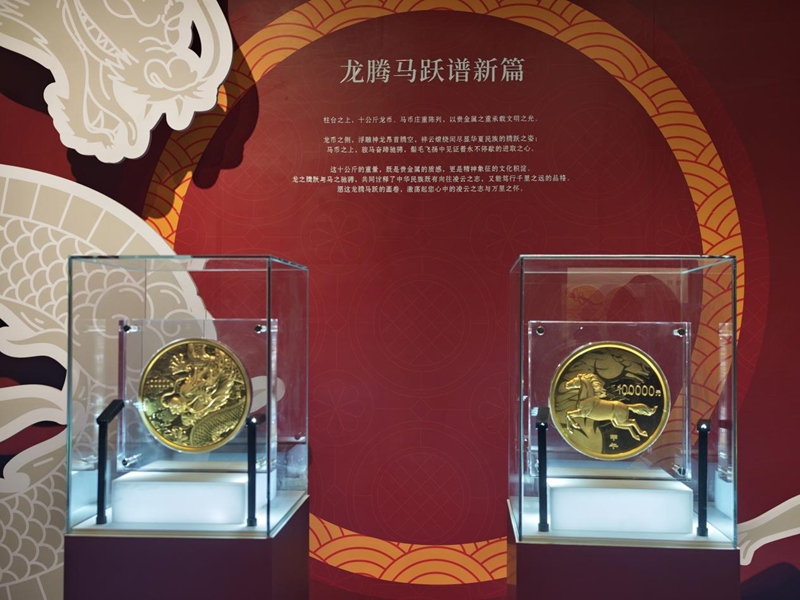 品鉴会上,重达10公斤的金质纪念币受到关注。该币背面图案为奔腾的群马与祥云、山峦景象,采用手工打造,运用高浮雕、多层喷砂等工艺,具有较强的视觉表现力。