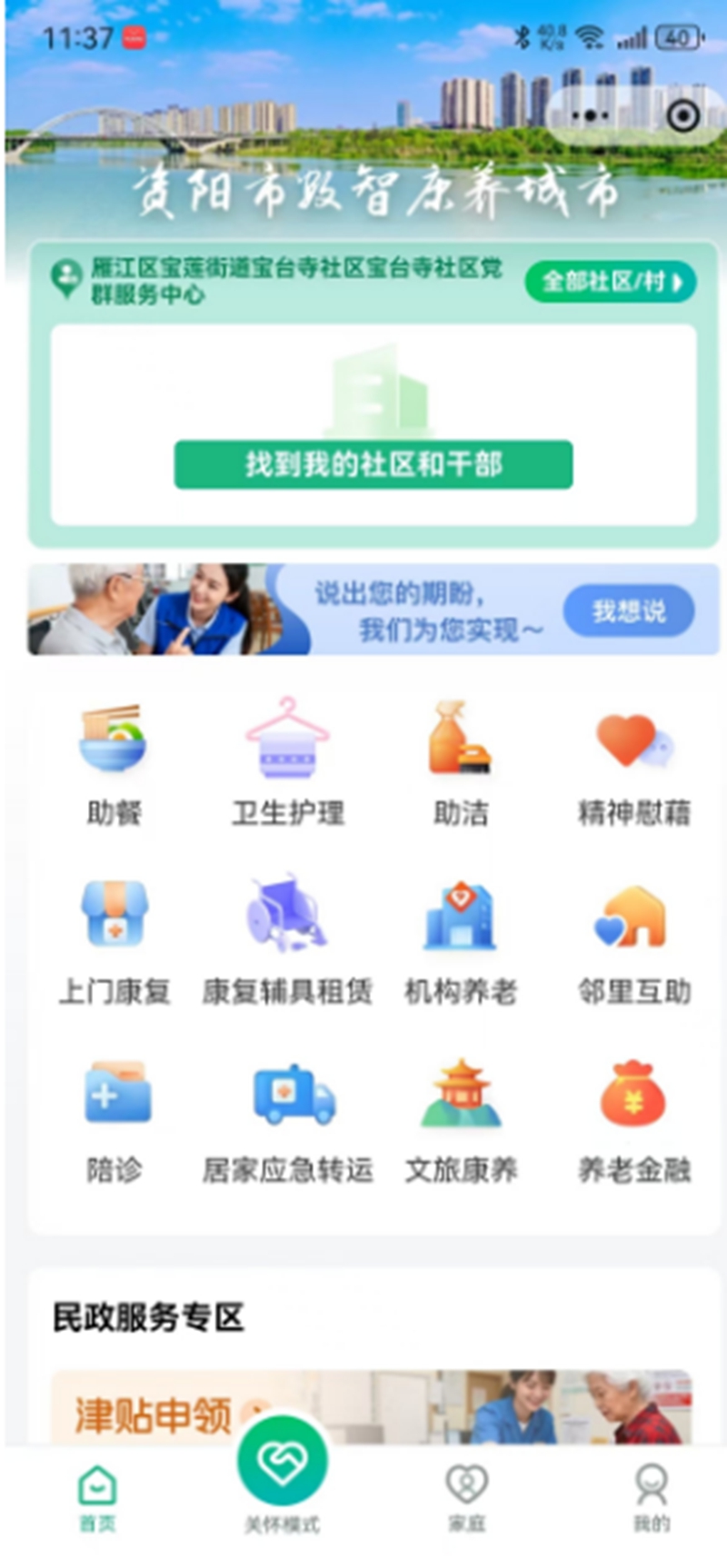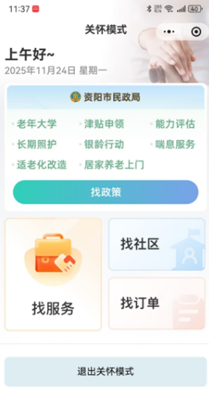资阳数智康养城市用户小程序老年人关怀模式。