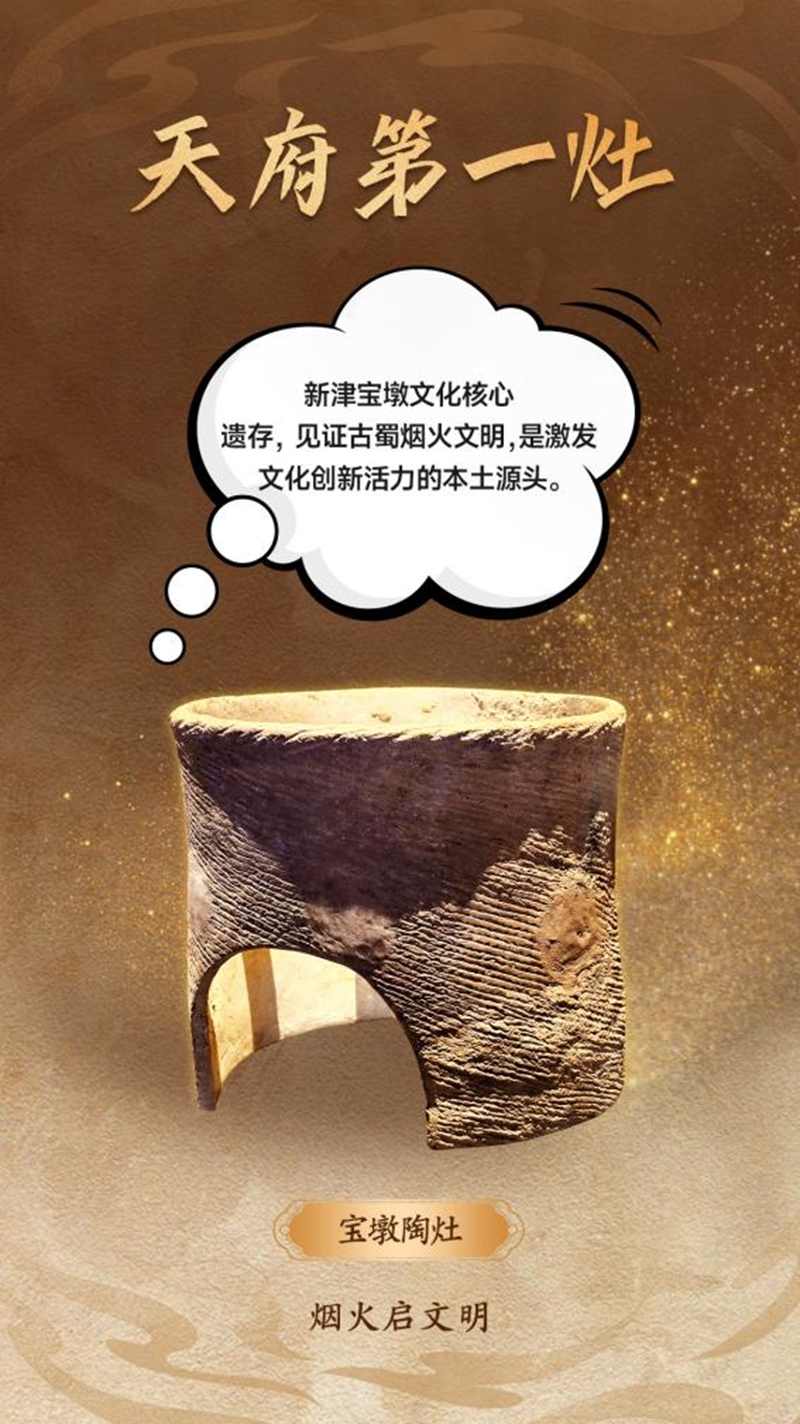 被誉为“天府第一灶”的宝墩陶灶,是新津宝墩文化的核心遗存。作为天府平原最早的烹饪重器,它见证了5000年前古蜀先民的烟火日常,以质朴的形制留存着早期人类的生活智慧,成为古蜀文明烟火气的最初印记,更是新津激活文化创新活力的本土源头。