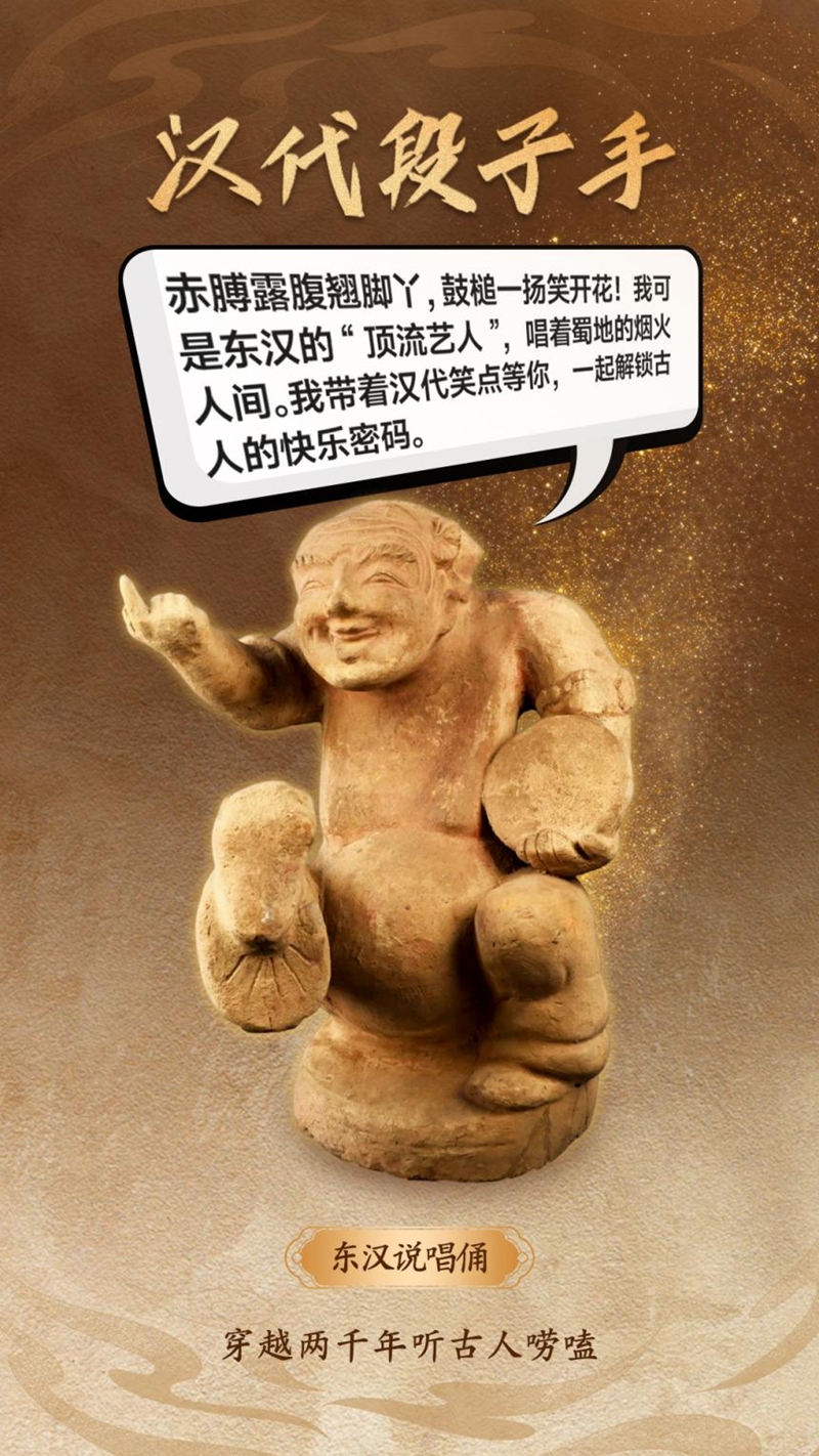 宝资山崖墓出土的东汉说唱俑,灰陶质地,高50厘米。俑身赤膊袒胸,翘足举臂,眉飞色舞,怀中抱鼓、指尖上翘的姿态,定格了说唱至得意处的鲜活瞬间。这件被专家誉为东汉艺术代表作的文物,以浓郁的生活气息讴歌真善美,尽显东汉雕塑艺术的高超造诣。