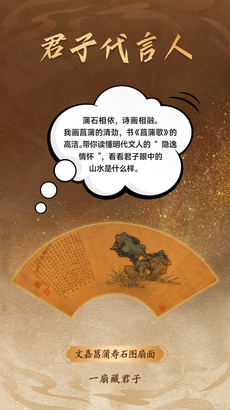 同样出自明代吴门画派的文嘉菖蒲寿石图扇面,诗书画印四美并臻。画面中蒲蕤石奇,青绿相映,辅以南宋谢枋得《菖蒲歌》题诗,既彰显了文人高洁耿介的气节,又蕴含“寿比蒲石”的美好祝福。作为文徵明之子的壮年力作,它是研究吴门画派传承与文人精神的重要实物。(完)