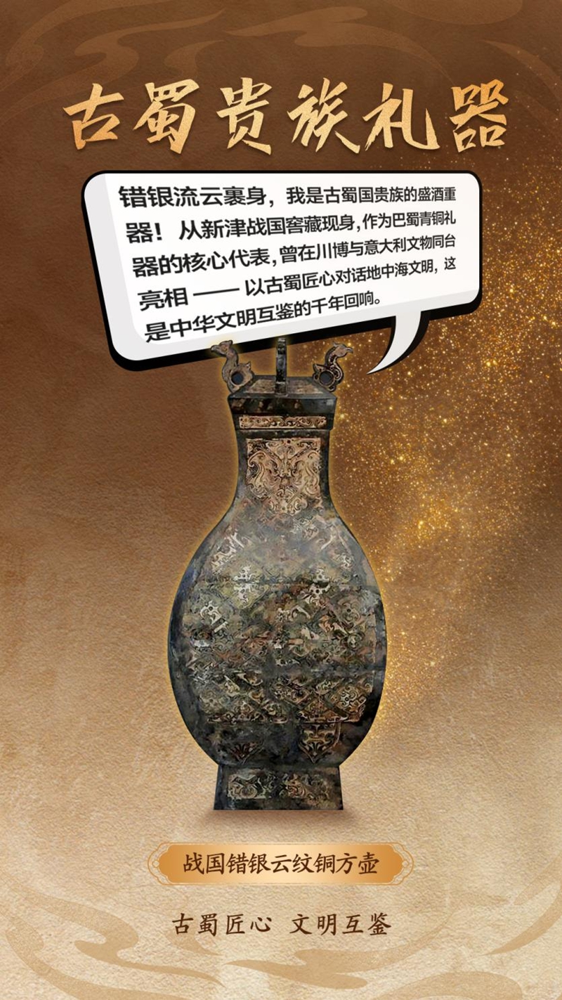 出土于新津机场的战国错银云纹铜方壶,是巴蜀青铜礼器中的珍品。通高55厘米,壶身错银饰云纹,鸟形钮灵动别致,嵌错工艺精湛绝伦。作为古蜀国贵族的盛酒重器,它曾在四川省博物院与意大利文物同台展出,以古蜀匠心对话地中海文明,奏响中华文明互鉴的千年回响。