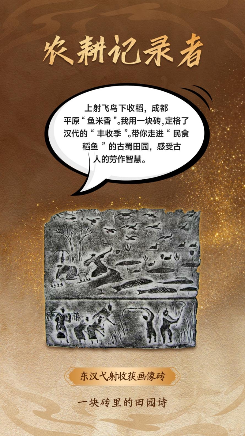 在安西镇收集的东汉弋射收获画像砖,模制浅浮雕工艺精巧。画面分上下两部分,上绘渔猎场景,下展稻田收获,将山水飞鸟、渔猎劳作融为一体,生动再现了汉代成都平原“民食稻鱼”的农耕文化风貌,是研究古代农业生产水平的珍贵实物。