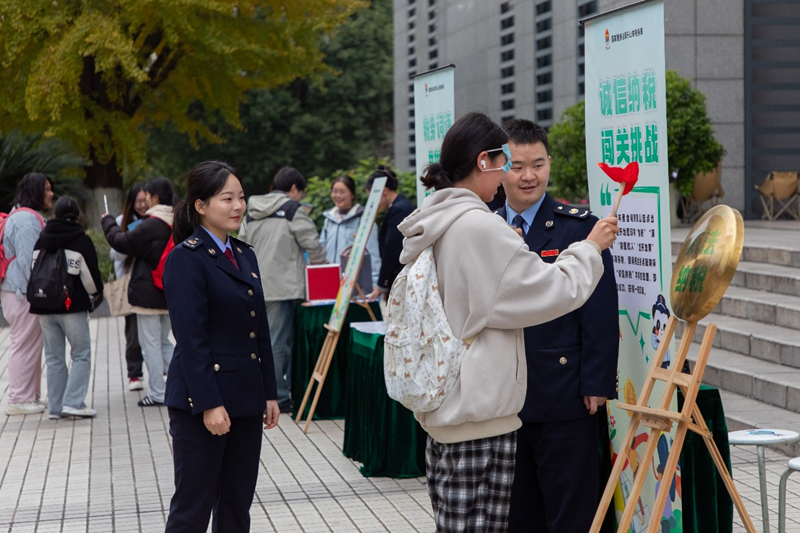 成都理工大学室外活动区气氛热烈,现场布置了农民画、剪纸等非遗作品以及四川税务新媒体矩阵,“套圈‘判官’”“税务词语拼拼乐”“诚信纳税闯关挑战”等互动小游戏将税收知识融入趣味体验中。学生们踊跃参与,在轻松愉快的互动中,税收政策以鲜活的形式深入人心。