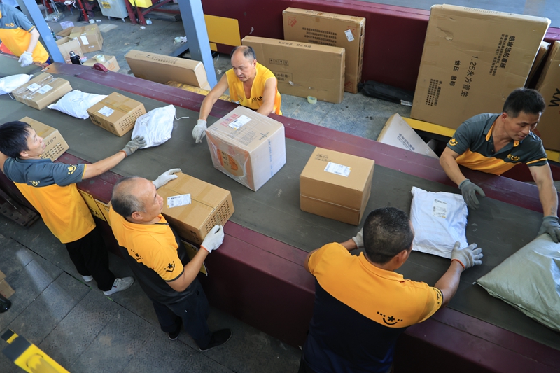 工人们忙着分拣包裹。(乐至县委宣传部 供图)