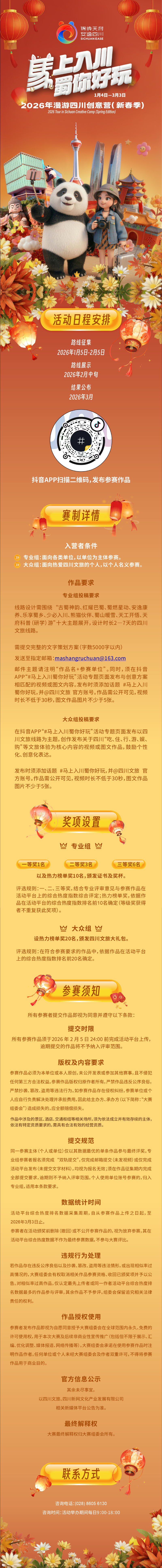 活动征集期为1月5日至2月5日,2月中旬将进行优秀作品展播,3月公布最终结果。目前,活动专题页面已在活动平台同步上线。更多相关信息,可通过四川文旅官方发布渠道查询。