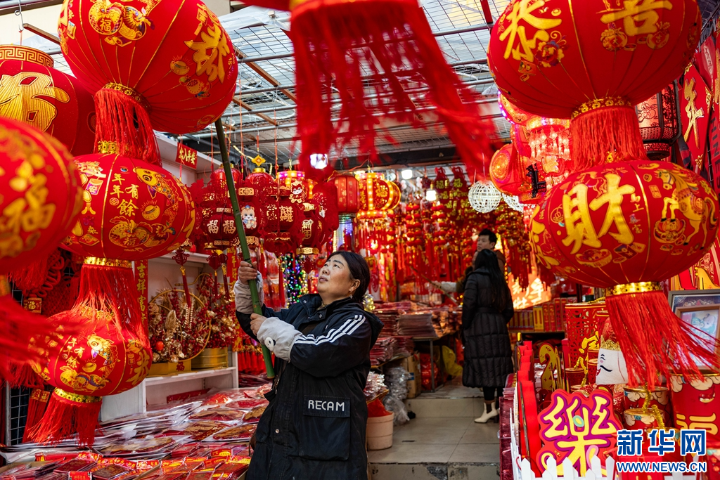 市民正在精心挑选春联和福字,市场内洋溢着热闹繁忙的采购氛围。