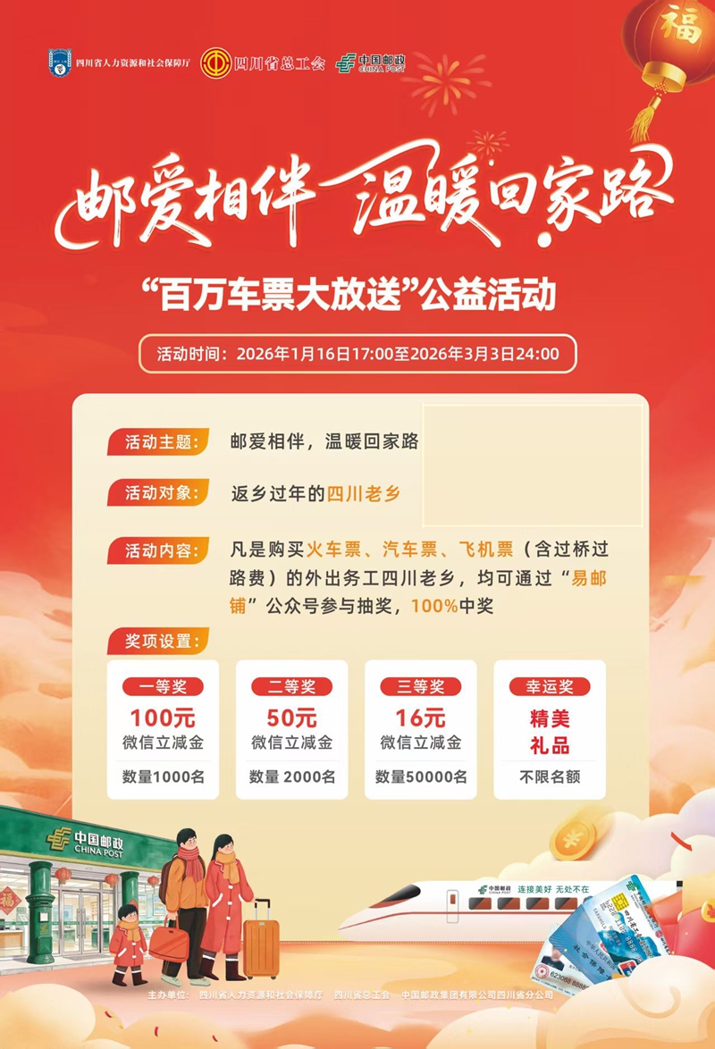 四川省邮政公司多年来始终聚焦务工老乡需求,在三农服务、务工关爱等领域推出一系列普惠举措。此次活动中,邮政将充分发挥网络优势与服务优势,联合省人社厅、省总工会做好活动宣传推广、参与引导、服务保障等工作,通过线上官方渠道与线下邮政网点联动,确保广大务工老乡便捷参与活动。(完)