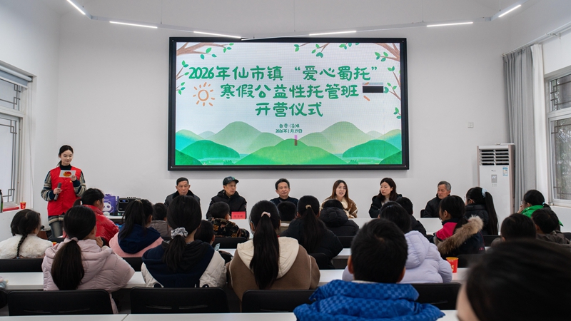 1月19日上午9时,四川省自贡市沿滩区仙市镇大岩村大岩虾塘会议室内,三十余名孩子的欢声笑语打破了冬日的宁静。仙市镇2026年寒假“爱心蜀托”公益性假期托管班开营仪式在此举行。此次托管班面向仙市镇大岩村及周边困境儿童、留守儿童,提供为期6天的免费托管服务。