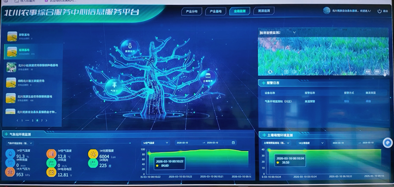 永昌镇双龙村的农事综合服务中心里,“云端”赋能正为春耕生产注入新动能。打开北川农事综合服务中心信息服务平台,大屏幕上实时呈现各地块土壤墒情、气象数据和苗情画面,实现农作物生长态势全程可视化。