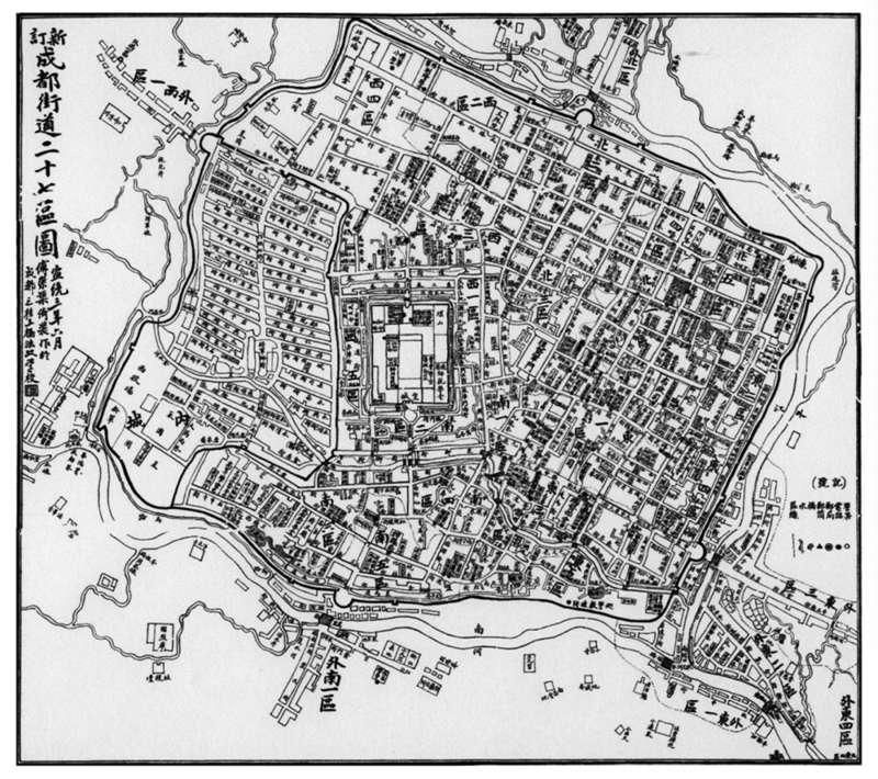 傅崇矩在《成都通览》自序中写道:“成都为省垣,成都、华阳两县附郭”,点明全书记述的核心区域是成都、华阳两县共治的省城城区(城墙内全域),但范围不止于城墙之内,还涵盖周边近城和乡场,完整勾勒出清末成都“城区—近城—乡场”的圈层结构,以及两县同城共治的独特城市格局。