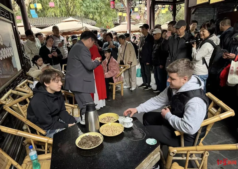 “今天是我们现场炒制的第一天,一位来自北京的游客,观看后当场下单了当天‘头锅’炒制的社前茶,并预约了后续更高海拔的春茶。”苏小峻向记者表示,这种体验不仅吸引国内游客,也成了对外文化展示的窗口。采访间隙,不断有外国面孔的游客好奇地询问炒茶过程,或购买现场制成的茶叶。“如今鹤鸣茶社每日接待的外国游客能达到上百人,占比约十分之一。他们对中国的传统技艺非常感兴趣,无论是长嘴壶茶艺表演,还是手工制茶,都愿意驻足观看、拍照,甚至亲自尝试。”苏小峻说。