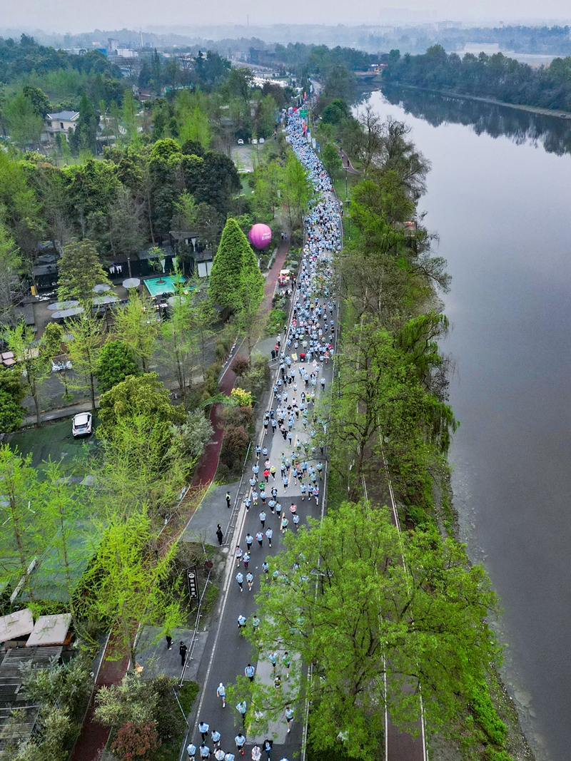 值得一提的是,此次赛事的完赛奖牌以紫薇花为形、以金马河、江安河为脉,杏花点缀其间,底纹是乡村林盘的抽象画,将温江的花木意象与奋进姿态巧妙融合。