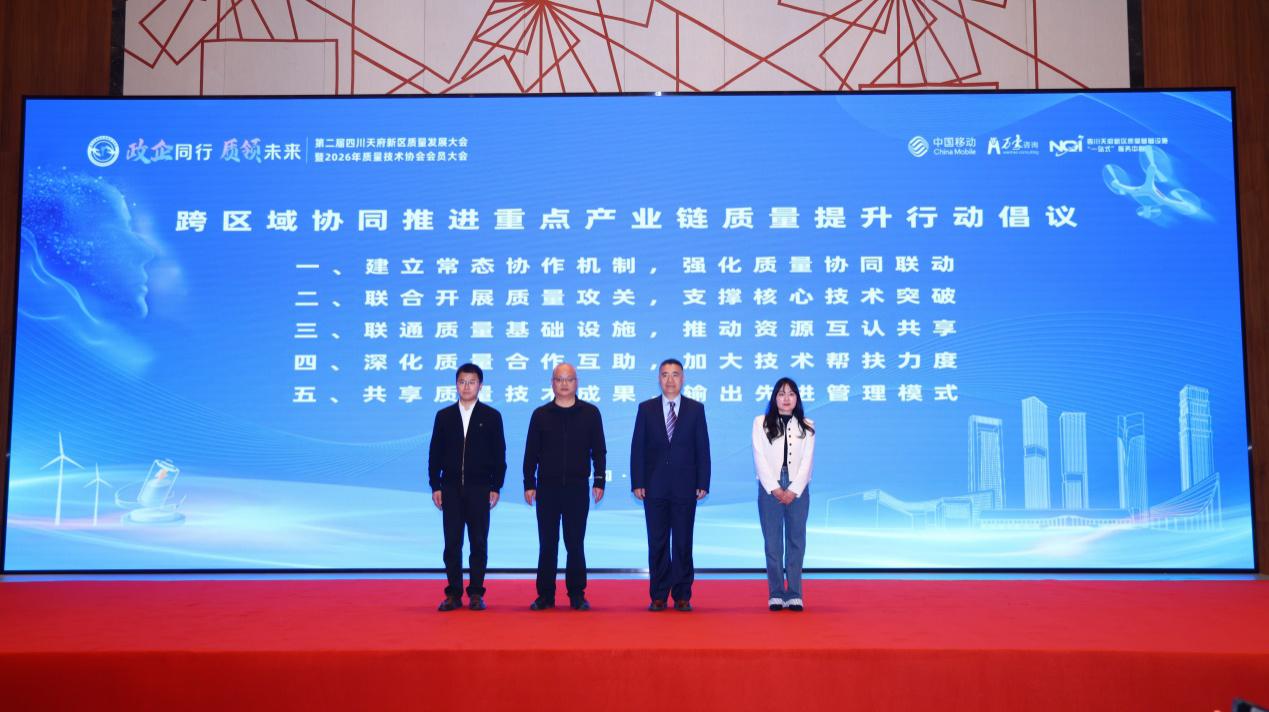 大会现场,四川天府新区市场监管局联合成都高新区、青羊区、彭州市市场监管局,共同发布《跨区域协同推进重点产业链质量联动提升倡议书》,围绕人工智能、航空航天、低空经济、先进能源等重点产业链,四地打破行政边界,建立常态化协作机制,推动质量基础设施互联互认,开展质量联合攻关,共享质量技术成果,以跨区域协同联动助力产业链供应链质量整体跃升。