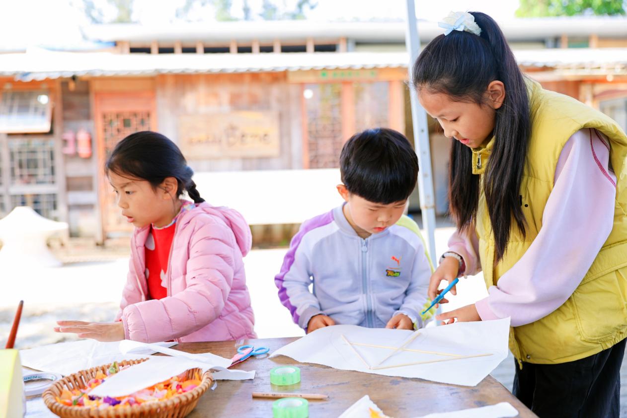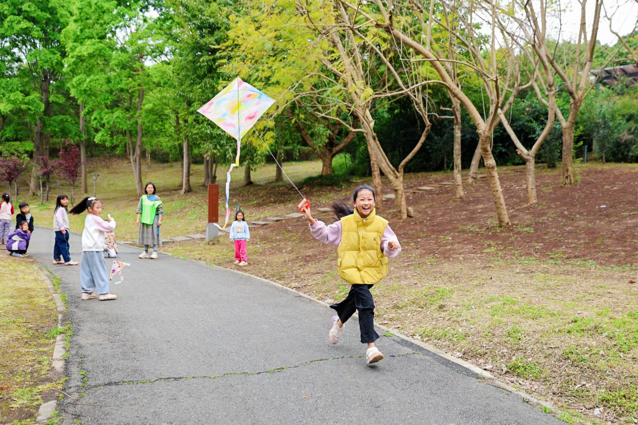 手工制作环节中,风筝制作、木工打磨上色等趣味活动,让普通儿童与特需儿童自发组队、互帮互助。特教老师与志愿者全程守护,既指导动手技巧,也及时关注孩子们的情绪。在披萨制作环节,四组操作台前,孩子们自主分工:揉面、撒芝士、铺配料,孩子们互帮互助,共同协作。午后,孩子们带着自制的风筝来到白鹭湾湿地公园,在公园小路上奔跑起来,笑声随奔跑洒满小路。