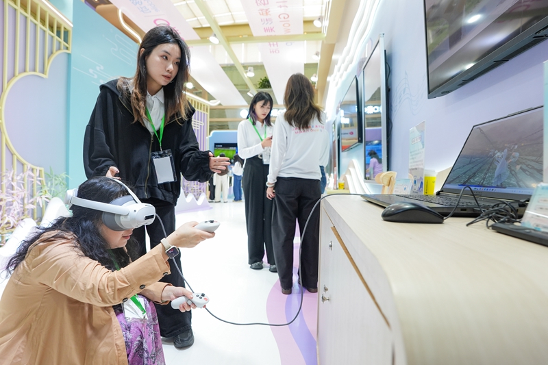 4月15日,参会者在创新展交区体验VR头显设备。