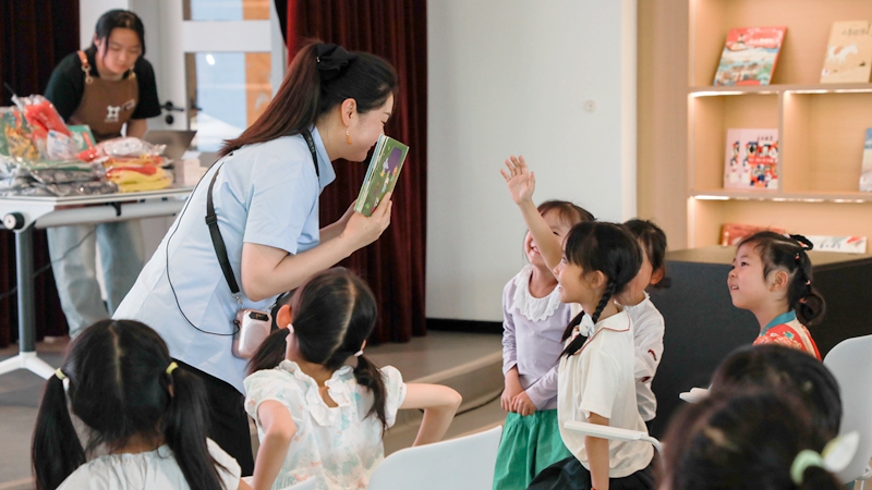 与此同时,位于“沿如遇”书舍三楼的小剧场区域变成了孩子们探索文学世界的乐园。“书香润童心·分享伴成长”儿童阅读分享会吸引了40名4至12岁的少年儿童及其家长参与。作为全民阅读周针对少年儿童群体定制的精品活动,分享会旨在通过资源整合与互动体验,提升少儿的语言表达和逻辑思维能力,搭建起亲子共读的桥梁。