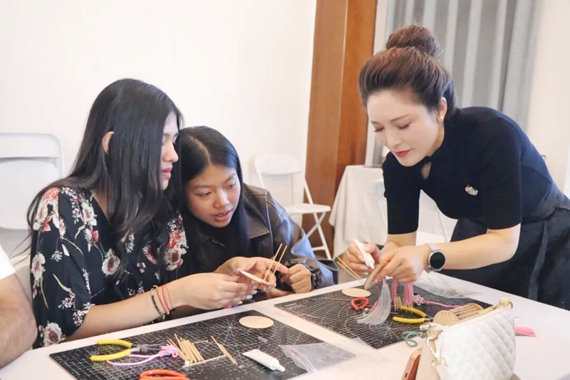 参观结束后,最受期待的手作体验环节在体验工坊开启。活动精心设置螺钿挂饰制作与竹编摆件编织两大项目,由传承人手把手教学,确保每位留学生都能亲手完成一件属于自己的作品,在实践中感受传统技艺的乐趣与魅力。