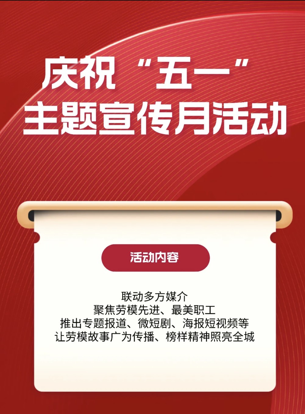 为弘扬劳模精神、劳动精神、工匠精神,展现四川职工风采与工会工作成效,营造崇尚劳动、关爱职工的社会氛围,凝聚奋进力量,联动主流媒体、工会融媒体与户外宣传阵地,采取多元形式宣传先进典型和工会服务实践等,讲好职工奋斗故事,讲好工会服务故事。