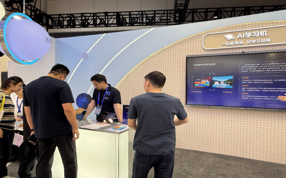 在华为展位,学而思与华为联合打造的学而思学习机吸引众多观众专注。该产品基于华为擎云C5e硬件平台,整合学而思教育内容资源与AI技术,提供智能学习解决方案。