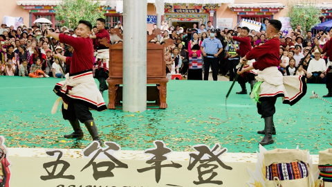 9月22日,四川省甘孜州巴塘县龙王塘群众文化公园内,鼓钹铿锵、长袖飞舞,一年一度的央勒节正在这里热闹举行。