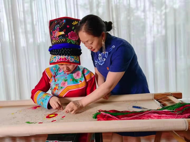 四川省非物质文化遗产项目羌绣代表性传承人陈云珍手把手指导学员练习羌绣针法。(北川县委宣传部 供图)