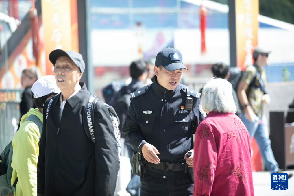 10月1日松潘县公安局民警在黄龙九寨站为老人指路。新华社发(李跃 摄)