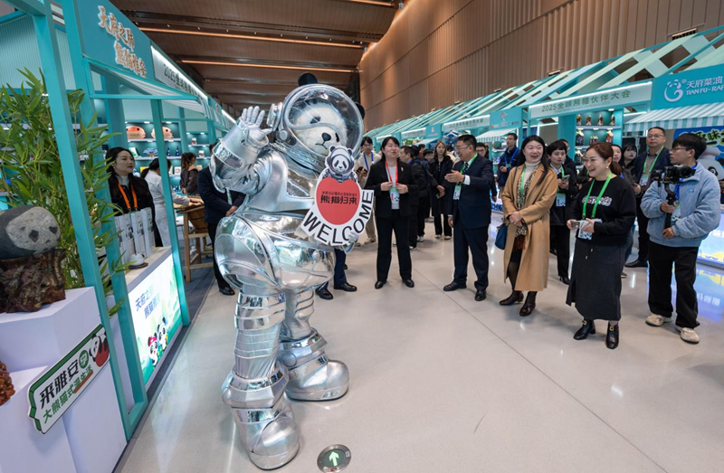 11月20日至22日,2025全球熊猫伙伴大会配套活动熊猫文创集市在成都空港国际会议中心亮相,现场熊猫文创、地方特色、科技创新等展品吸引众多观众互动体验。