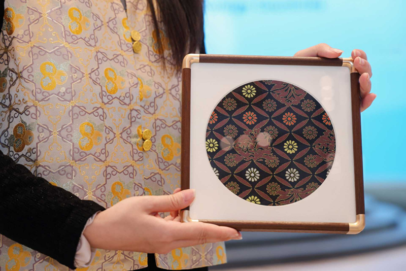 同期亮相的框画蜀锦摆台由蜀江锦院首席织锦大师、国家级非遗代表性传承人贺斌率领织锦团队监制织造。摆台图案采用手工寿菊纹锦这一蜀锦创新纹样,将宋代流行的铜钱纹与写生花卉纹巧妙融合,以传统蜀锦纯手工织造工艺织就,传递出“延年益寿、财运亨通”的美好祝愿。(完)