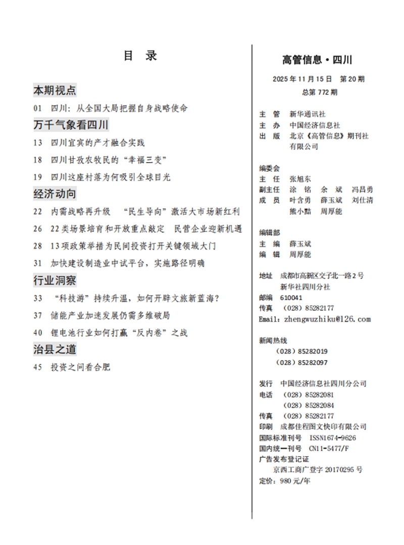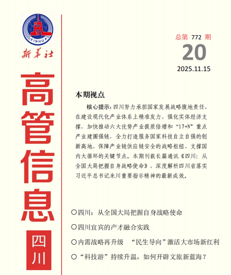 《高管信息·四川》刊物由新华社四川分社着重打造,稿件立足四川在全国发展大局中的战略定位,以做好经济宣传引导为重点,努力为奋力谱写中国式现代化四川新篇章献智献策。